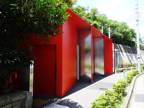 真っ赤なトイレは遠くからでも目立つ。歩道際にあるのが、少し引っ掛かる。