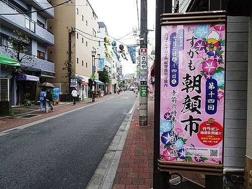 道路の脇には「第十四回 すがも朝顔市」の看板が出ていた。