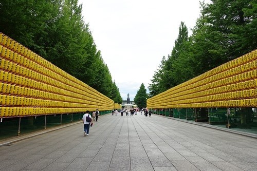 九段下駅を出て「大鳥居」のところに行くと、両側に大量の黄色い色の提灯が見える。