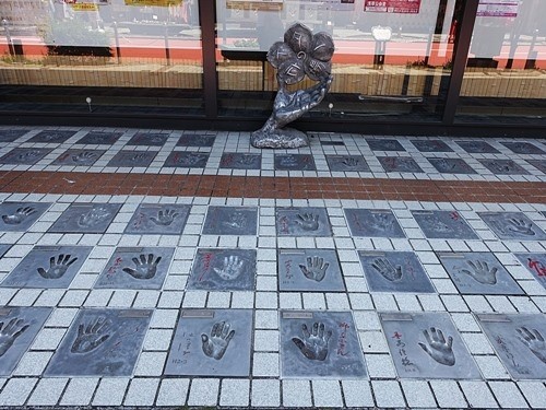 公会堂の前に行くと、日本の芸能界のスターの手形が埋め込まれているのが見える。