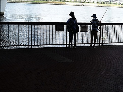 私の前をジョギングする人達、散歩をする夫婦、釣りをする人達が見える。