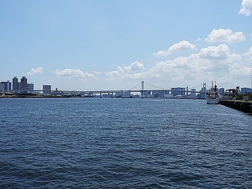 すると遠くにレインボーブリッジが見え、大型客船が出て行くのが見えた。