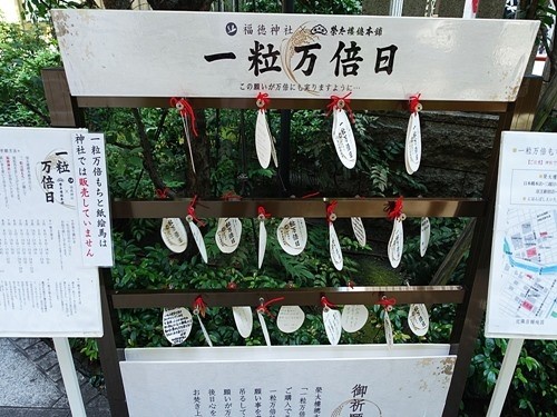 神社の前に「おみくじを吊るしてあるな」と思い注意して見たら、「一粒万倍日」と書いてあった。更によく見ると、『榮太樓で一粒万倍日に販売している「一粒万倍もち」を購入し、その日にもらえる「一粒万倍絵馬」を持って福徳神社に行きお参りし、絵馬を飾ると願い事が万倍になる』と書いてあった。