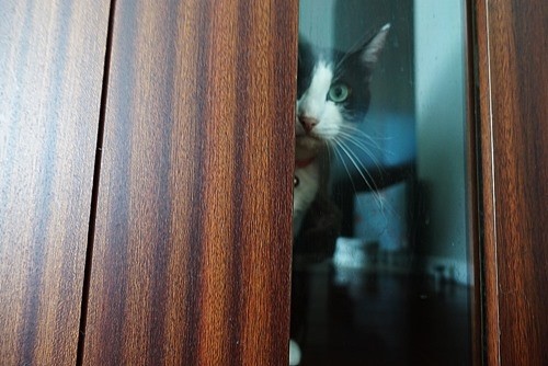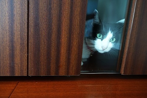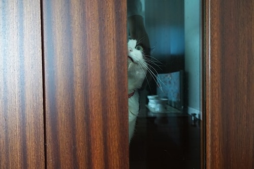 洗面所のドアから入れるのに、開けるのを待っている。