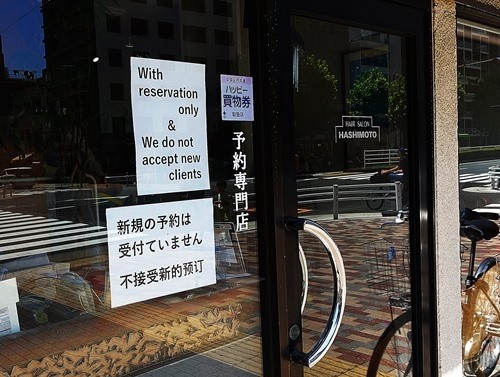 そこで近くで調べてみたら、月島には3軒もの床屋があった。その1軒は完全予約制の上に、「新規予約は受け付けていない」と日本語の他に、英語、中国語で書かれているのでビックリした。