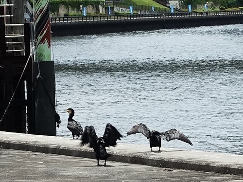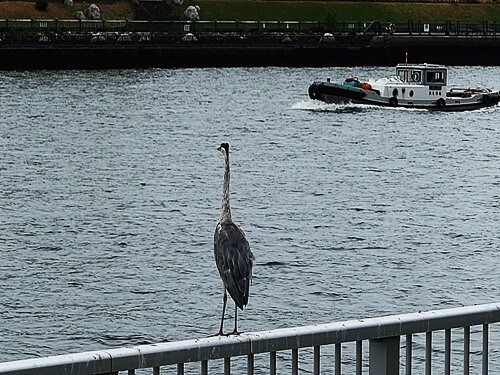 隅田川沿いの人が通れないテラスでは、川鵜が濡れた羽を乾かしていた。