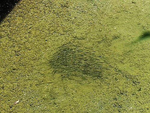 吉神社の裏の水路に行ったら、なにやら黒い群れが泳いでいた。