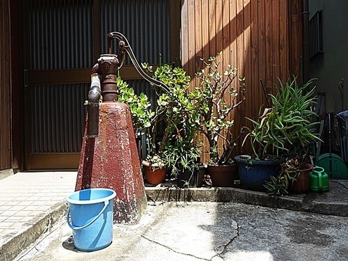すると右側の民家に懐かしい「井戸用手押し式ポンプ」がある。