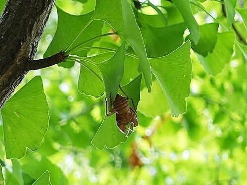 そこで傍の木の上を見やると、セミの抜け殻が葉っぱにしがみ付いているのが見えた。よく探すと、アチコチにいっぱいセミの抜け殻が見付かった。