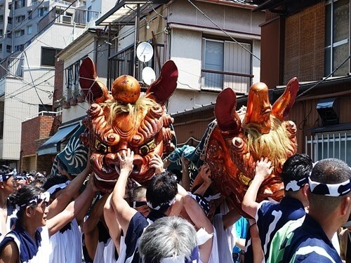 佃祭の予定を見ると、8月4日(土)大祭式、町内神輿巡行。5日(日)獅子頭・町内神輿勢揃い巡幸。6日(月)宮神輿(八角神輿)宮出し、船渡御。7日(火)宮神輿宮入となっている。祭が最高潮に達するのは、5日の「獅子頭」の宮出しから始まる。