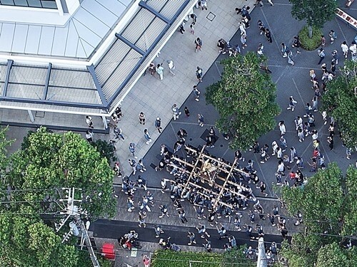 遠くからで良く見えなかったが、新兵器だ。マンションの敷地に入り休憩となり、管理組合が飲み物などを振る舞っていた。午後5時になり、巡幸して来た神輿が向かいのマンションの広場に入るのが見えた。