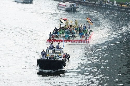 船が近付いて来ると、先頭の船には「お囃子」の一団が乗っているのが見えた。