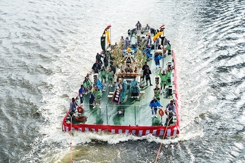 「船渡御」とは祭礼の神事のひとつで、神体や神霊を船に乗せて川や海を渡す行事である。住吉神社の「船渡御」は大阪では盛大に行われているので、その流れを受け継いでいるものと思われる。