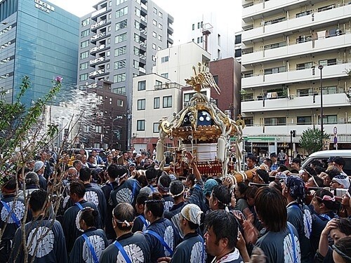 前日に私の住むマンションにやって来たのは「町神輿」で、私の住む町内の所有する神輿である。「宮神輿」というのは神社所有の神輿で、住吉神社には関東では珍しい八角形の神輿がある。地元民はこれを愛称の「八角」と呼んでいる。