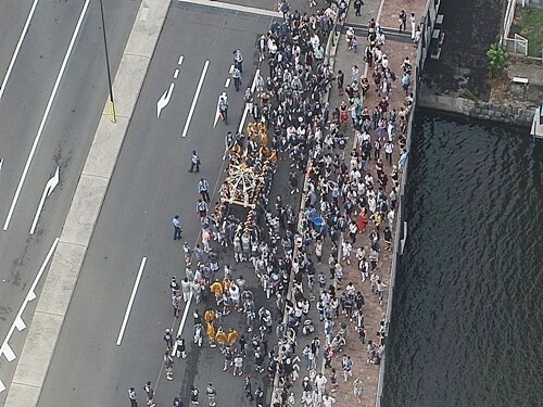 しばらく休憩した後に、また宮神輿は進み出した。そして新島橋の上を通過した。