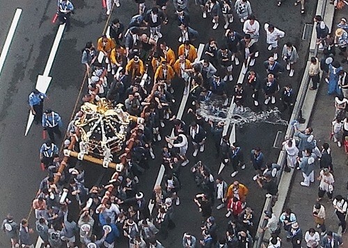 窓から清澄通りを見ていたら、勝どき駅付近を宮神輿が通過するのが見えた。