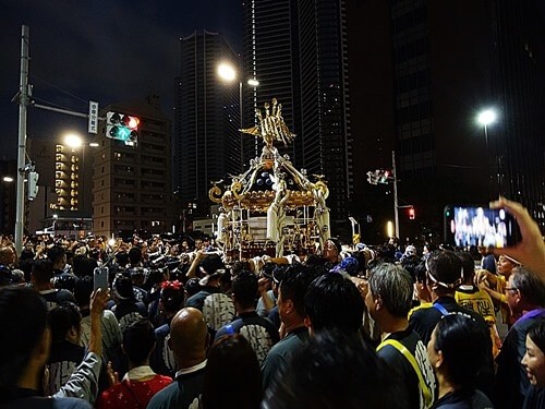 今までの巡行の時には無かったような、担ぎ手と応援団の盛り上りである。