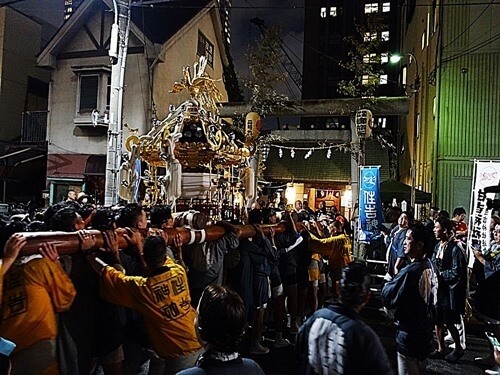 マンションの向かい側で待ち受けると、少し疲れ果てた感じで神輿がやって来た。