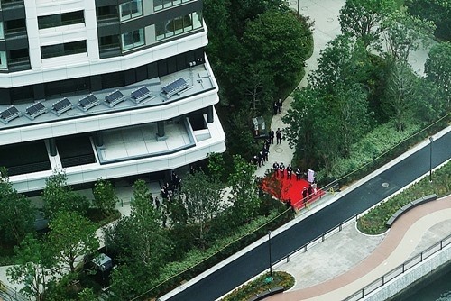 8月28日の午前9時に、我が家の窓から見たら、黒服の男達が大勢集まり除幕式みたいなことをやっていた。そしてその少し前にLINEで、『8月31日・午前9時00分より「パークタワー勝どき」前の運河のテラスが開通します』とお知らせがあった。