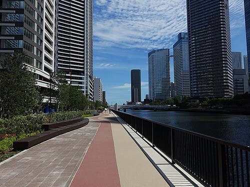 隅田川から分流している「新月島川」が、「晴海運河」と合流する左角にあるのが「パークタワー勝どき」である。運河沿いに整備されたテラスは、新しいから気持ちは良い。