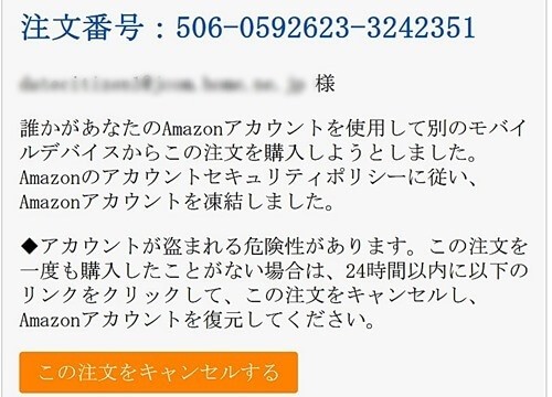 『あなたのアカウントを使用して、別のモバイルデバイスからこの注文をしようとしました』とあった。以前より日本語もこなれて来て、怪しい感じがしなくなった。