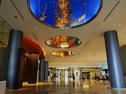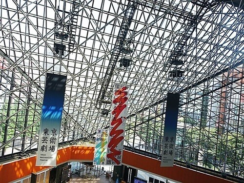 東京芸術劇場の建物の館内に入ると広い空間があり、中央が地下から天井まで吹き抜けている。1階からエスカレーターで2階に上がると、次に乗り換えるエスカレーターは一挙に5階に上がれる。エスカレーターから見る様子は、美しく組まれた鉄骨構造が明るい光で館内を照らしている。