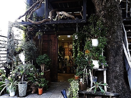 花屋の入口の上にツリーハウスがある。