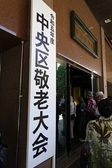 入口の大きな「中央区敬老大会」の看板