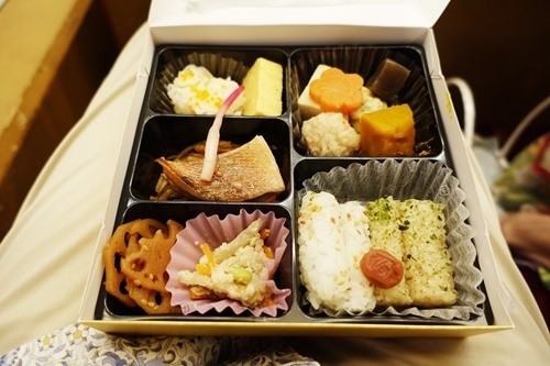 11時から始まった芝居は12時少し前に1幕目が終り、そこから40分の休憩で支給されたお弁当を自分の席で食べる。食中毒を心配してか、いつも酢飯の幕の内弁当である。