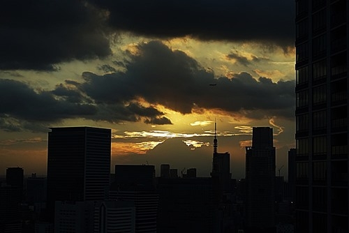それを飽きもせずに眺めている私だ。この写真にもよく見ると、東京タワーの上の雲の中に飛行機が見える。