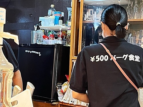 「500円バーグ食堂」のTシャツ姿の店員