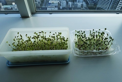 種を蒔き、1週間くらいで収穫となる。最近は食卓にカイワレ大根が登場することが増えた。