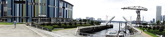 運河沿いのテラスを歩いて、クレーンとドックを見に行く。