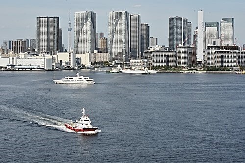 「レインボーブリッジ」の下から、2隻のタグボートが晴海埠頭に向かうのが見えた。きっと日本丸の離岸のための作業に向かっているのだと思った。