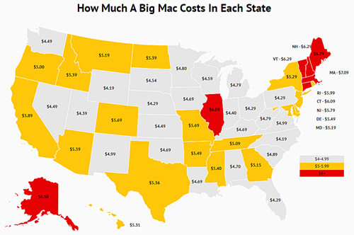 アメリカは広いので、州によって値段が違うようだ。安い州でも673円、高い州だと975円もする。家族4人でこれにコーラとポテトフライを注文したら、庶民の食べ物ではなくなってしまう。