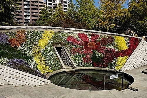 横網町公園を入ったところに、洒落たデザインの目立つ花壇がある。