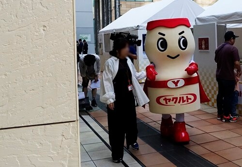 少し前にも別のイベントでヤクルトをもらったが、係の女性に渡されたので受け取った。その時にヤクルトの変なキャラクター「ヤクルトマン」がやって来て、コマーシャルの撮影を始めたのでそれを見た。