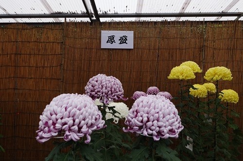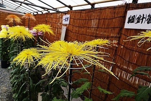 参道の両側には、3棟の葦簀張りの菊の花の展示がある。菊の花は3本に枝分かれさせて、上に立派なが3つの花が咲いている。私の同級生のKさんが菊作りの名人で、遂には審査員にまでなったのを思い出した。