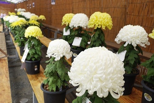 一同が菊の花の前で、みんな一緒に記念写真を撮った。