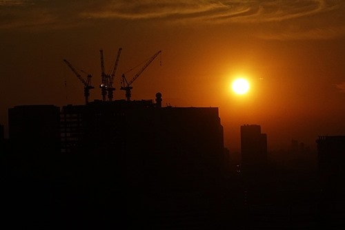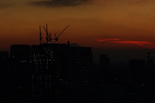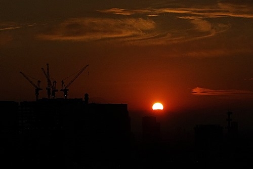 屋上に立てられているクレーンが、自然とは相容れない物なのに、それがあるので夕陽が目立つ。そして考えた。「次々と建つ高層ビルだが、500年後にはどうなっているだろう?」
