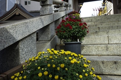 石段を上り頂上で右に行くと、そこにはお馴染みの菊の花が並んでいた。