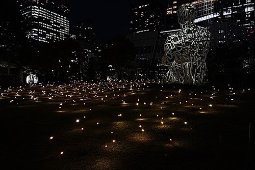 ビジネスタワーで2階に上がる。そして渡り廊下を通過して森タワーに入ると、右側に芝生の広場がある。その芝生に豆電球を敷き詰めてあり、それが風でゆらゆら揺れる。この作品が「Firefly field」である。その意味は「ホタルの原っぱ」だろうか?