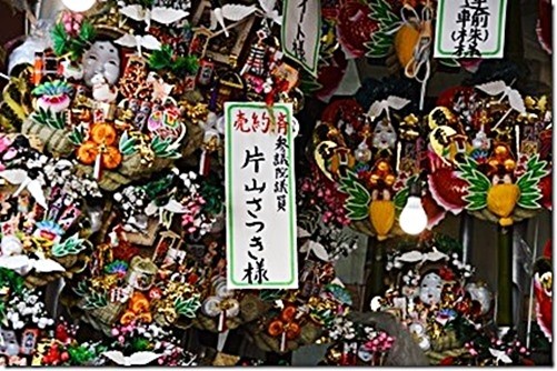 日本武尊が東夷征討の際に鳳(おおとり)神社に立ち寄り戦勝祈願をされ、戦の後にまた鳳神社に立ち寄って戦勝を記念して、神社の松の木に武具の熊手を架けたのが鳳神社の「熊手」の始まりだそうである。