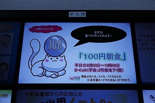 更に面白く驚いたのが、掲示板に出ていた学食の「100円朝食」である。