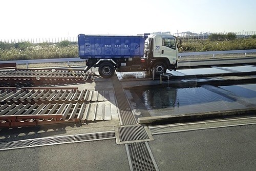 場外に出て行く車は、ここでタイヤの汚れを落とす。