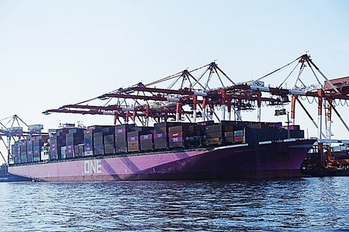 大型貨物船から「ガントリー・クレーン」でコンテナを下す。