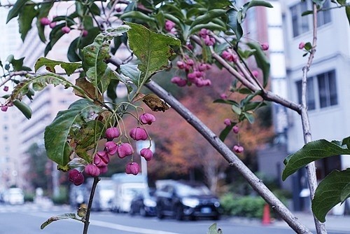 途中に小さな街路樹が植えてあり、前に気が付いた時は緑色の実がなっていた。それが秋になり、可愛いピンクの実となった。
