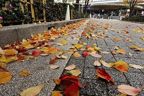 桜の葉の紅葉が最終を迎え、道路に落ちて広がっている。