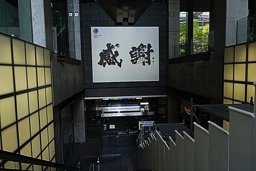 バス通りから館内に入ると、そこには大きな書で「感謝」という文字が見える。これは書道家の「金澤翔子」の作品で、「東京国際フォーラム21周年記念」に寄せた作品である。