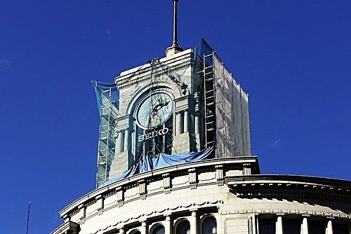 銀座4丁目の「和光」がディズニー100周年記念とコラボして、時計塔の文字盤をミッキーマウスにしていて通行人を楽しませていた。この企画は10月5日から11月18日までで、私が見上げた時は文字盤を元に戻すために工事中だった。